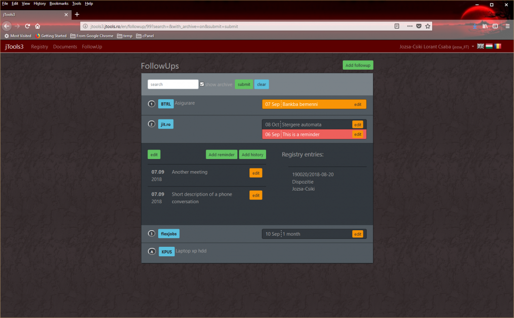 This application is suitable for personal use and also for small teams/companies. The basic idea behind this cloud based platform is to help in manage multiple projects. For example selling an industrial equipment involves a lot of mailings, phone conversations, meetings and can easily last for several months. The Project FollowUp module will help you to keep track of events (by adding history to the project) and to plan further steps (by adding reminders to the project). Also you can use the Registry Module to keep track of your documents, like quotation, orders, contracts, etc ...
